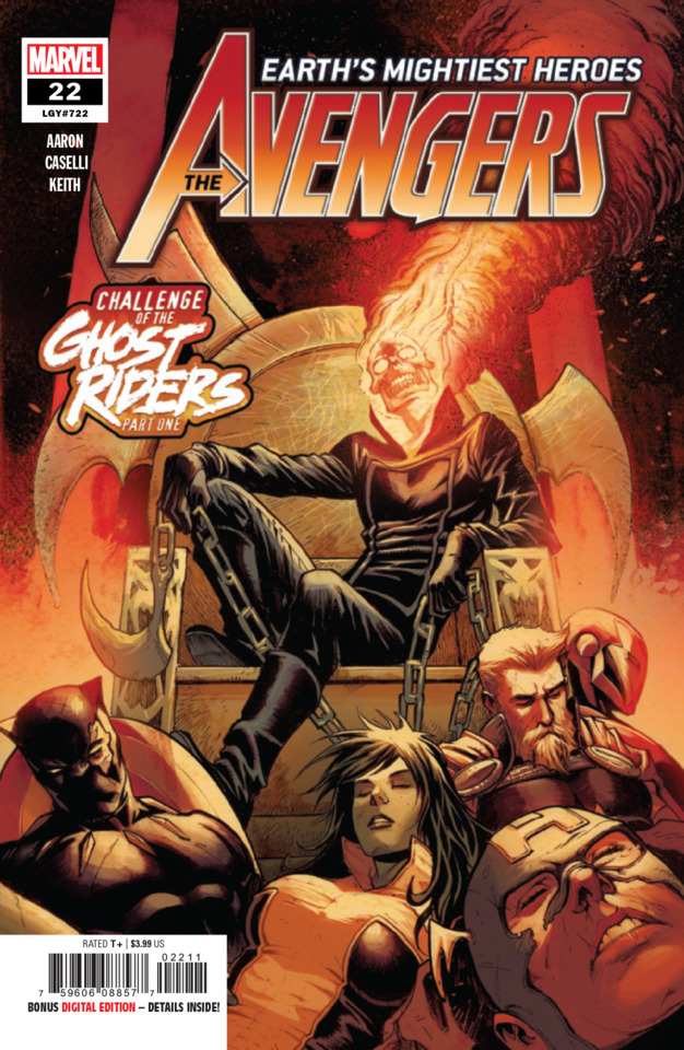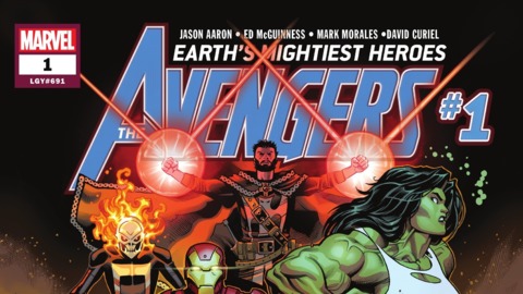 Volume 7 Note : Volume named per indicia. Ongoing series. After issue 690 of Avengers Vol. 6 , the series revamps with a new #1 as Avengers Vol. 7, and continues the legacy numbering, making the 1st issue of the series also the 691st continued issue. After issue 17, the Avengers: No Road Home mini-series takes place with legacy numbering 708 to 717, with issue 18 resuming the legacy numbering at 718. Following issue 66, the series continued in Avengers Vol. 8 . Writers Jason Aaron #1-59 Mark Russell #60 Pencillers Ed McGuinness #1-6, 10-12, 18-20, 27-30, 32, 38, 50 (TOT 19) Paco Medina #3-6, 29 (TOT 5) Sara Pichelli #7 David Marquez #8-10, 14-17 (TOT 7) Andrea Sorrentino #10, 13, 26 Adam Kubert #10, 13, 26 Jason Masters #21 Stefano Caselli #22-25 Luciano Vecchio #24 Dale Keown #26, 39 Jan Bazaldua #31 Gerardo Zaffino #31 Geraldo Borges #31 Szymon Kudranski #31 Robert Gill #31 Mattia De Lulis #31 Javier Garron #33-37, 40, 41, 43, 44, 46-50, 55-59 (TOT 19) Juan Frigeri #51-54 Luca Marecsca #42, 45 Flaviano Armentaro #49 Greg Land #60 Collected Editions Avengers by Jason Aaron: The Final Host (#1-6) Avengers by Jason Aaron Volume 1 (#1-12) Avengers by Jason Aaron: World Tour (#7-12) Avengers by Jason Aaron: War of the Vampires (#13-17) Avengers by Jason Aaron Volume 2 (#13-21) Avengers by Jason Aaron: War of the Realms (#18-21) War of the Realms Omnibus (#18-20) Avengers by Jason Aaron: Challenge of the Ghost Riders (#22-25) Avengers by Jason Aaron Volume 3 (#22-30) Cosmic Ghost Rider Omnibus (#22-25) Avengers by Jason Aaron: Star Brand Reborn (#26-30) Avengers by Jason Aaron: The Age of Khonshu (#31-38) Avengers by Jason Aaron: Enter the Phoenix (#39-45) Avengers by Jason Aaron: World War She-Hulk (#46-50) Avengers by Jason Aaron: The Death Hunters (#51-56) Avengers by Jason Aaron: History's Mightiest Heroes (#57-62) Avengers Assemble (#63-66) Non-U.S. Collected Editions Avengers Collection: Avengers (#1) (German)